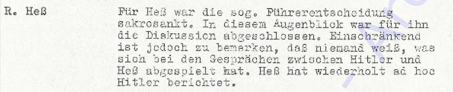 “Einschrankend ist jedoch zu bemerken, dass niemand weiss, was sich bei den Gesprächen zwischen Hitler und Hess abgespielt hat. Hess hat wiederholt ad hoc Hitler berichtet.”