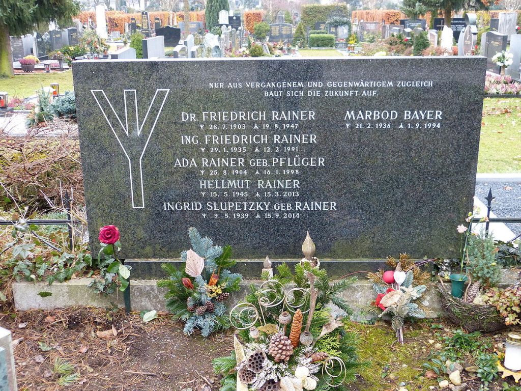 Il s’agit de Friedrich Rainer (1903-1947 ?), gauleiter de Salzbourg après l’Anschluss, muté à Klagenfurt (Carinthie) en 1941, augmentant son domaine vers le sud en 1943 après la capitulation de l’Italie, arrêté par les Britanniques en 1945, témoin au procès de Nuremberg (cité par la défense de Seyss-Inquart), extradé vers la Yougoslavie et exécuté (officiellement, la date est contestée) le 18 août 1947. Dans les années 1990, son corps est rendu à sa famille et son nom domine une superbe pierre tombale au cimetière de Klagenfurt, le présentant comme un très honorable patriarche. Découvrant la chose en mai 2016, je la mentionne sur ISSN-Facebook (contribution présentement inaccessible) et sur d’autres sites. Echantillon :